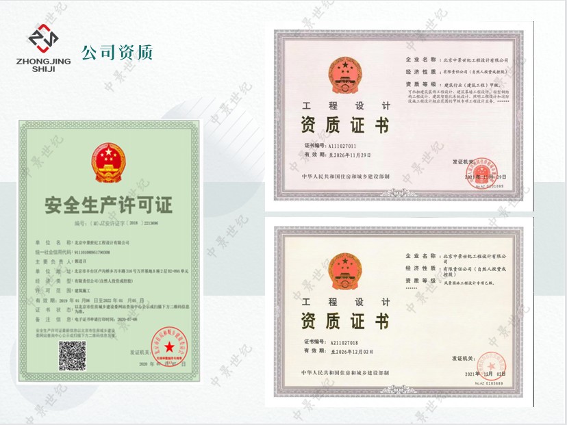 北京中景世紀工程設計有限公司成立于2014年,公司注冊資本金5040萬元,注冊地位于北京市豐臺區。公司具有住房和城鄉建設部頒發的建筑行業(建筑工程)設計甲級資質、北京市規劃和自然資源委員會頒發的風景園林工程專項乙級資質、北京市住房和城鄉建設委員會頒發的建筑裝修裝飾工程專業承包貳級施工資質。